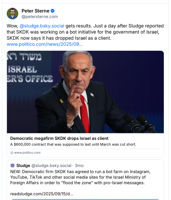 Two day ago, Sludge reported SKDK was planning to run a bot farm on Instagram, YouTube, TikTok and other social media sites for the Israel Ministry of Foreign Affairs to "flood the zone" with pro-Israel messages. https://t.co/1EBu2IGqzH